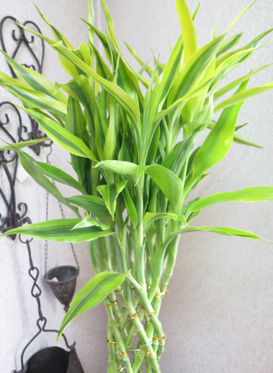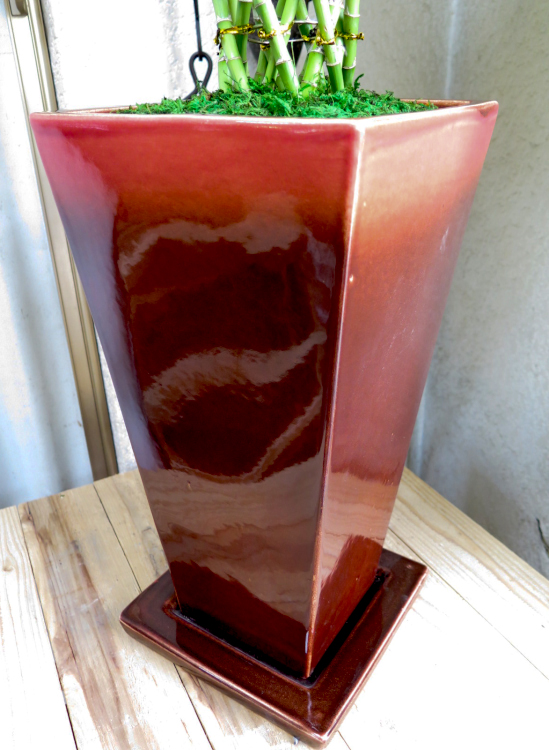 縁起がいい名前で人気のミリオンバンブー(万年竹)と 渋みのある赤色が高級感がある鉢との大人っぽいコーディネートです。 緑と赤はお互いを引き立てあって美しいです。 |