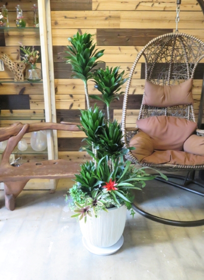 たっぷりのミニ観葉植物と共に寄せ植えしました。 乾燥にも寒さにもとても強く丈夫で育てやすい植物なので 特別な御祝にもオススメです! 鉢は樹脂製。高級感を損なうことなく重量や破損の心配を軽減。 取り扱いのしやすさを実現しました。 |