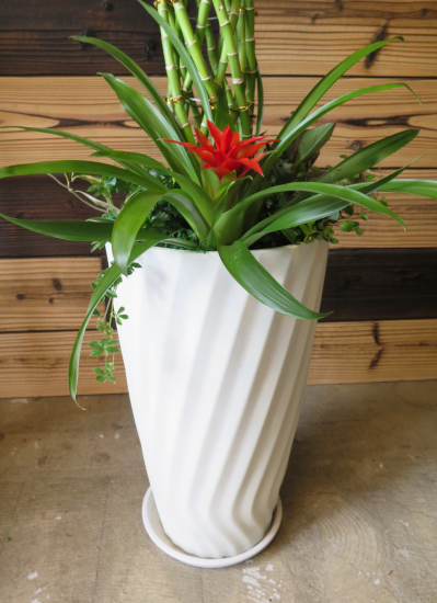 明るい色の葉っぱは見映えよく、足下の寄せ植えでさらに華やかに。 デザイン性の高い樹脂製鉢を使用していますので、 高級感を損なうことなく重量や破損の心配を軽減。 取り扱いのしやすさを実現しました。 とっておきの大切な御祝に自信をもっておすすめします。 |