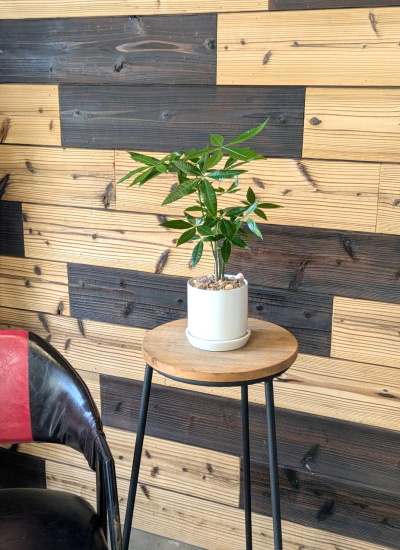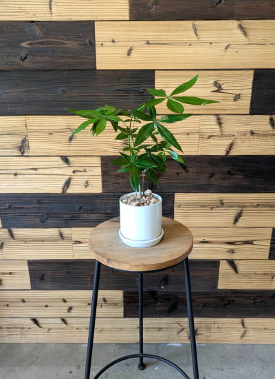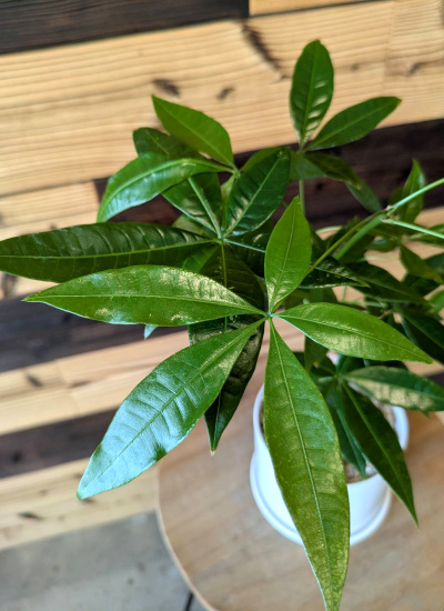 ▲手のひらを広げたような葉がかわいらしいパキラ。