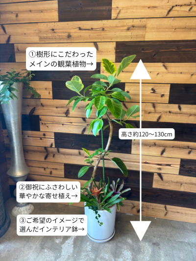 高さ約120~130cm×幅約40cm×奥行き約40cm ※上記は参考サイズです。 ※こちらの商品は、お客様のご希望に応じて植物と鉢をコーディネートさせていただく商品です。 ※お客様と当店での、メールおよびお電話でのご相談の上「中央の背の高い観葉植物」+「足元のミニ観葉植物」+「インテリア鉢」を決定いたします。 ※お届け希望日までの日数に合わせて、できる限りの対応をさせていただきます。ご遠慮なくお申し付けください。 ※実際には「かっこいい感じでおまかせします!」とイメージのみでご注文されるお客様も多いです。お気軽にご利用ください。 ※こちらの商品は即日発送はできませんのでご了承下さいませ。 〔内容〕 ・観葉植物(高さ120~130cm程度) ・ミニ観葉植物、数種 ・インテリア鉢、受け皿付き ・観葉植物の育て方しおり ・立て札、ラッピングは無料です |
