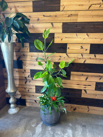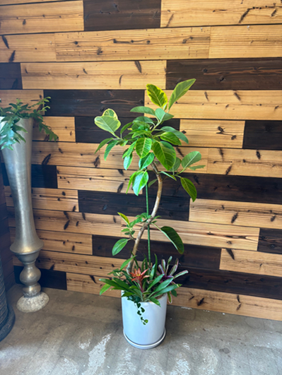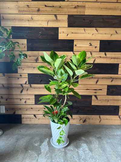 人気のアルテシーマです。枝分かれした幹と葉の茂り具合のバランスがばっちりです。足元のミニ観葉は赤いグズマニアを植えて華やかにしました。 |
