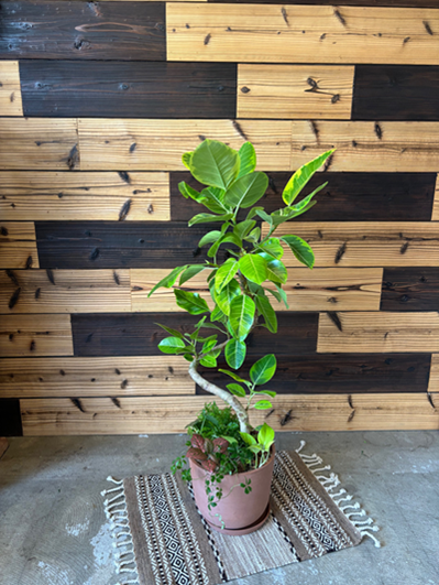 すらりとしながらも幹の真ん中でカーブをしている味のある樹形のベンガルゴムです。アート的のイメージを強調するように、パープルカラーのグズマニアとコーディネートいたしました。 |