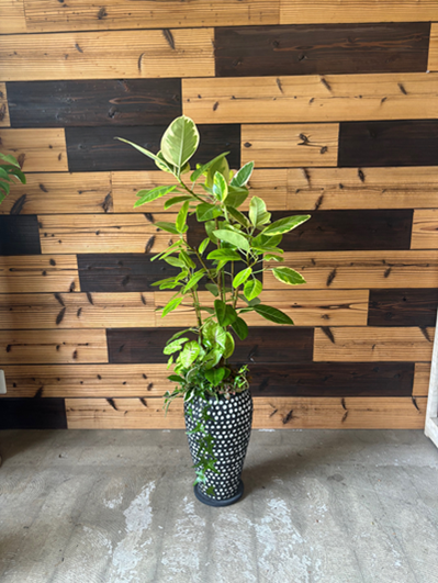 シルバー色の葉が美しいベンガルゴムです。ドット柄の個性的な鉢でアート的にコーディネートしました。 |
