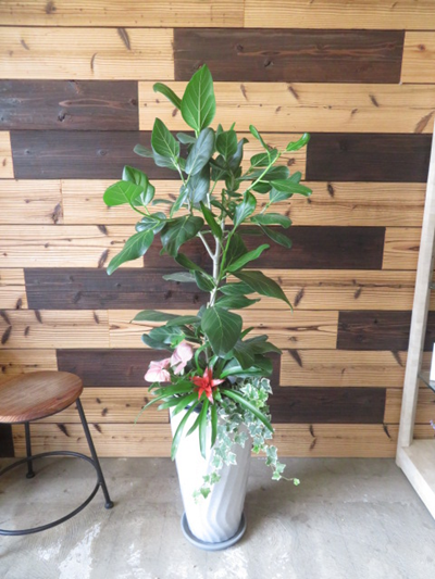 開店の御祝にご注文いただきました。かっこいいイメージで丈夫な植物をご希望でしたので、葉っぱの色が濃くて厚みがある男性的なイメージのアポロゴムをお選びしました。 |